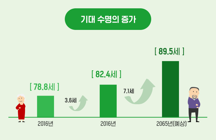 2017년 12월 통계청 발표에 의하면 2016년 현재 우리나라의 기대수명은 82.4세(남자 79.3세,여자 85.4세)입니다.이는 2006년 현재 평균기대수명인 78.8세보다 3.6세나 늘어난 것이며 통계청이 발표한 『장래추계인구』자료에 따르면 2065년에는 남자 88세,여자 91세로 예측할 수 있다고 합니다.