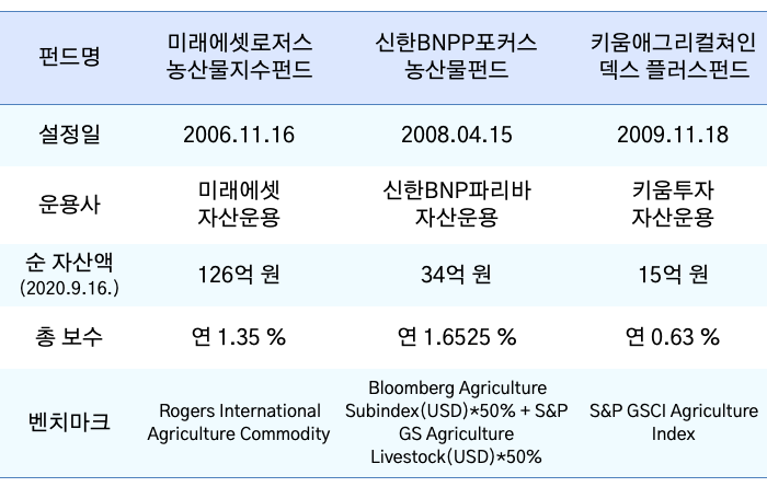 농산물에 투자하는 펀드도 있습니다. 세 펀드 중 자산규모가 가장 큰 미래에셋로저스농산물지수펀드는 농산물 투자의 대가라고 불리는 짐 로저스의 이름을 딴 Rogers International Agriculture Commodity 지수를 벤치마크로 삼고, 농업 관련 일반 상품을 기초자산으로 하는 장내파생상품에 주로 투자를 하고 있습니다. 이 외의 두 펀드는 자산규모가 아주 작은 소규모 펀드입니다.