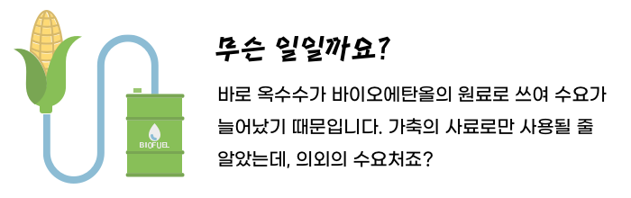 미국 정부에서 자동차 연료의 10%는 바이오에탄올을 사용해야 한다는 법률(Energy Policy Act of 2005)이 제정되면서 옥수수 가격이 상승하였습니다.