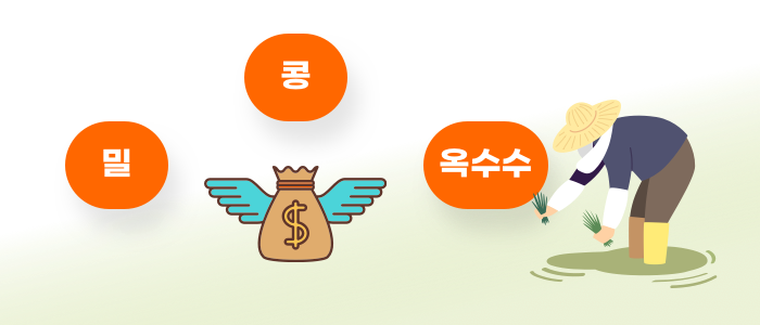 농산물에 대한 투자는 3대 농산물로 불리는 밀, 콩, 옥수수 선물에 대한 투자가 대부분입니다.