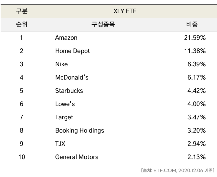 XLY ETF는 ‘State Street Global Advisors’에서 1998.12.16에 발행한 세계 최대 규모의 경기소비재 ETF로 그 규모가 약 19조 원(기준일 2020.12.06)이 넘습니다. 당연히 경기에 더 민감한 주식들로 구성이 되어 있으며 주로 호텔, 엔터테인먼트, 소프트웨어, 인터넷, 자동차, 여행과 관련된 주식들에 투자합니다.