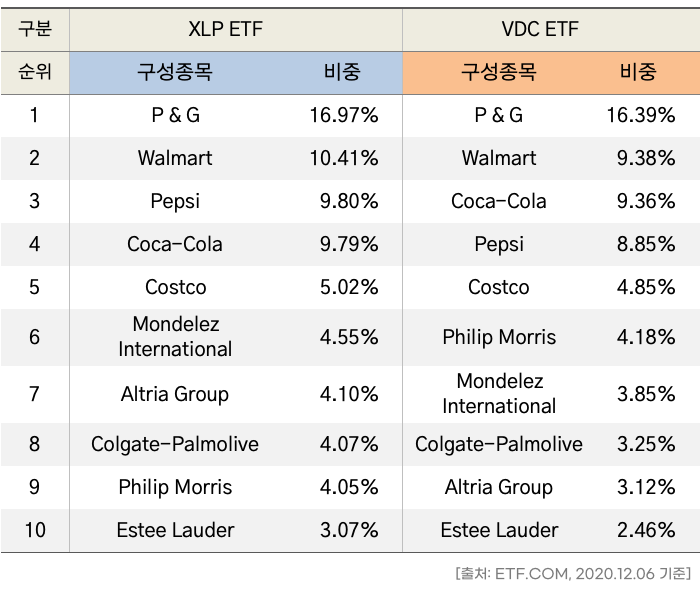 미국 생활소비재에 투자하는 XLP ETF는 ‘State Street Global Advisors’에서 1998.12.16에 발행한 ETF로 그 규모가 약 15조 원(기준일 2020.12.06)에 이르는 세계 최대 규모의 소비재 ETF입니다. 또 다른 미국 생활소비재 ETF인 VDC는 ‘Vanguard’에서 2004.01.26에 발행한 ETF로 그 규모가 약 6조 원(기준일 2020.12.06)이 넘는 소비재 ETF입니다. VDC ETF는 운용보수가 0.1%로 매우 저렴한 편입니다.