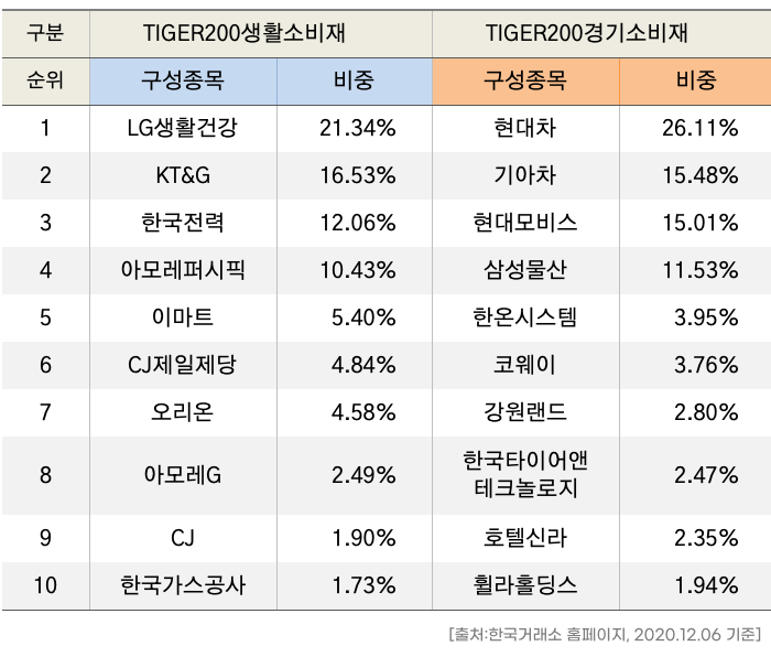 TIGER200생활소비재(코드:227560)와 TIGER200경기소비재(코드:139290)인데요, 둘 다 소비재ETF이지만 투자하는 종목이 생활필수 소비재이냐, 경기민감 소비재냐에 따라 담고 있는 종목이 확연히 달라집니다.
