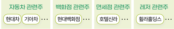 경기소비재는 대중들이 소비하는 재화, 용역 중 상대적으로 덜 필수적이며, 재정 상태에 따라 소비패턴의 변동이 큰 소비재를 뜻합니다. 자동차 관련주(현대차, 기아차 등), 백화점 관련주(현대백화점, 롯데쇼핑 등), 면세점 관련주(호텔신라 등), 레저 관련주(휠라홀딩스 등) 등을 꼽을 수 있습니다.