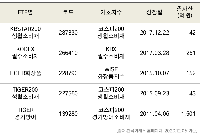 우리나라 증시에는 총 5종의 생활소비재 ETF가 상장되어 있습니다.