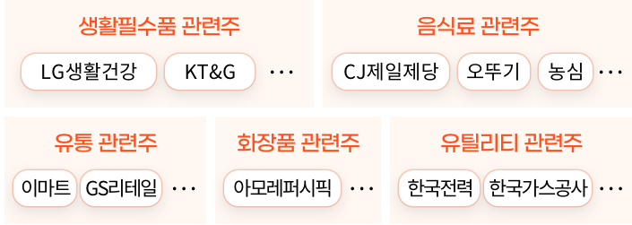 생활에 꼭 필요한 소비재 관련 주식으로는 생활필수품 관련주(LG생활건강, KT&G 등), 유통 관련주(이마트, GS리테일 등), 음식료 관련주(CJ제일제당, 오뚜기, 농심 등), 화장품 관련주(아모레퍼시픽 등), 유틸리티 관련주(한국전력, 한국가스공사 등) 등을 꼽을 수 있습니다.