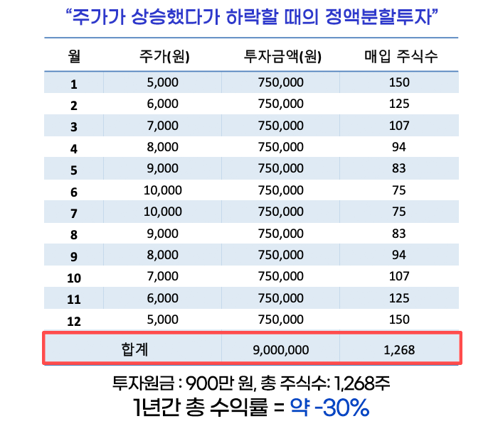위의 사례는 우리가 늘 보아왔던 정액분할투자의 효과를 극대화하여 보여주는 상황입니다. 1만 원이었던 주가가 크게 하락하여 5천 원까지 떨어졌다가, 다시 1만 원까지 상승하는 반대 상황에서의 정액분할투자 효과는 잘 알고 있습니다.