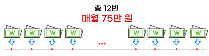 1년 동안 매월 한 번씩 12번에 걸쳐 투자한다고 가정하겠습니다. 주가가 상승할지 하락할지 모르기 때문에 주가의 등락을 고민하지 않고, 매월 75만 원씩 투자하였습니다.