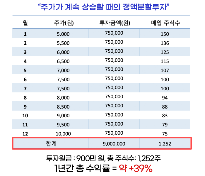주가가 계속 상승한다면, 적립식 투자도 꽤 큰 수익률을 거둘 수 있지만, 일시금을 투자한 경우보다는 낮은 수익률을 기록할 것입니다.