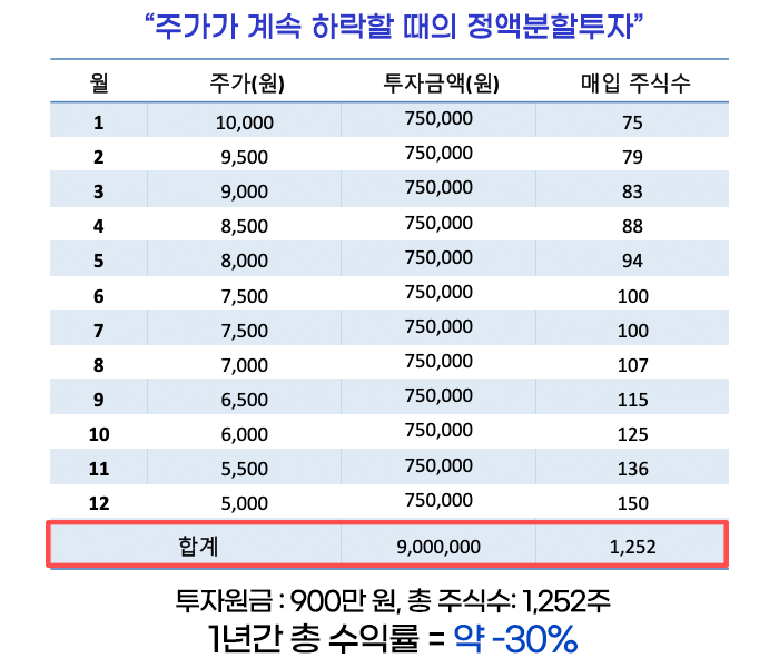하지만, 한꺼번에 주식을 모두 매입했다면 -50%의 수익률을 기록했을 것입니다. 주가가 계속 하락한다면 정액분할투자로도 손실을 피할 수는 없지만, 일시금을 투자한 경우보다는 손실폭을 줄일 수 있습니다