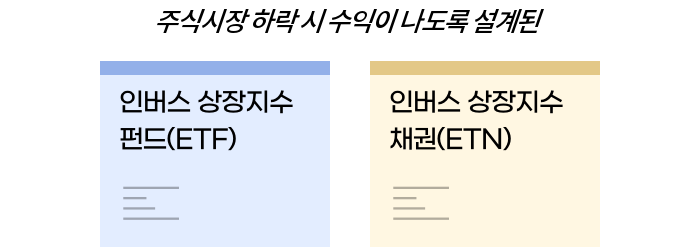 비교적 쉽게 그리고 가장 많이 알려진 전략으로는 주식시장 하락 시에 수익이 나도록 설계된 인버스 상장지수 펀드(ETF)와 인버스 상장지수 채권(ETN)에 투자하는 것입니다.