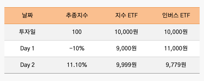 인버스 상품의 경우 하루 동안의 지수를 추종하고 난 뒤에 다시 자산을 리셋(Reset)하게 되는데, 시장이 10% 내린다면 인버스 ETF는 10% 상승하게 되지만 다음날에는 다시 이것을 100으로 놓고 시작하기 때문에 차이가 발생하게 됩니다.