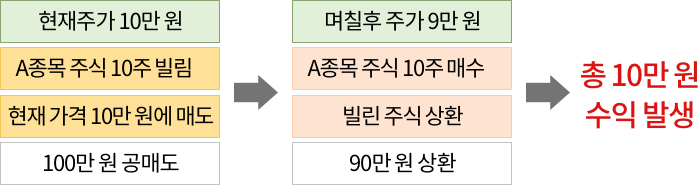일반적으로 주식매수자금을 확보해서 해당 금액만큼 주식을 산 뒤 오르면 팔아 해당 차액을 노리는 구조와 반대되는 개념입니다.