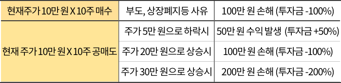 하락은 기존 주가에서 -100%까지 제한이 있다 하더라도 주가상승은 제한이 없다 보니 이론적으로 손실은 무한대로 커질 가능성이 있습니다.