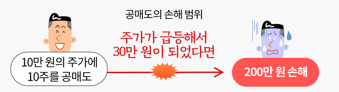 A라는 기업의 주가가 하락할 것으로 생각하고 10만 원씩 10주를 공매도를 했는데, 오히려 주가가 급등해서 30만 원으로 간다면 손해는 예상했던 수준 이상(-200만 원)으로 커지게 되는 것입니다.