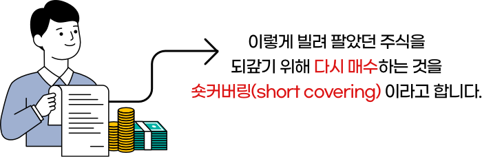 또 다른 방식은 빌려온 주식을 매도하는 차입 공매도(Covered short selling)로, 보관된 주식을 갖고 있는 한국예탁결제원이나 증권사 등에서 주식을 빌려 매도하는 형태입니다.