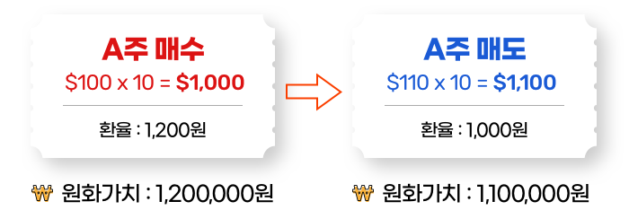 분명 매매차익만으로는 $100의 수익을 거두었지만 원화로 계산해보면 환율이 떨어져 결국 100,000원의 손해를 본 거래가 되고 말았습니다.