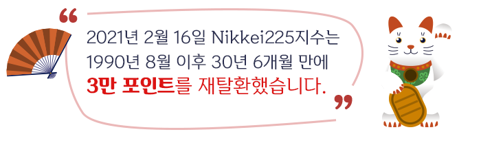 1989년 12월 29일 38,916포인트로 최고치를 찍었던 Nikkei225지수는 1990년 8월 3일 3만 포인트를 벗어난 이후 장기 불황의 늪에서 벗어나기 힘들었습니다.
