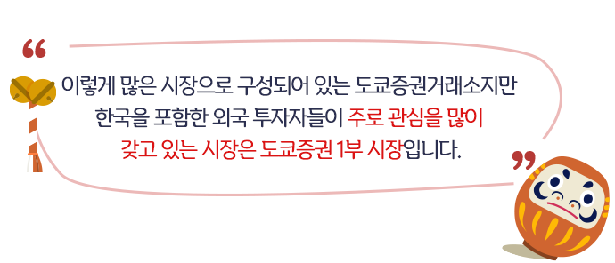 도쿄증권거래소는 도쿄증권 1부, 도쿄증권 2부, 마자스(마더스), JASDAQ 등으로 구성되어 있습니다.