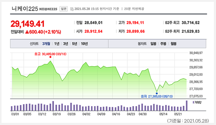 한국예탁결제원 자료에 따르면 한국 투자자의 일본주식 보유금액도 2019년 18.7억 달러, 2020년 25.9억 달러, 2021년 3월 말 30.1억 달러로 지속해서 증가하는 추세라고 합니다.