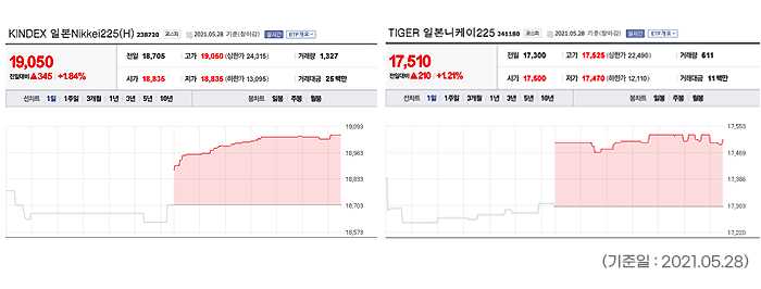 반면, TIGER일본니케이225는 원/엔 환율 리스크에 노출되어 있다는 것이 KINDEX일본Nikkei225(H)와 다른 점입니다.