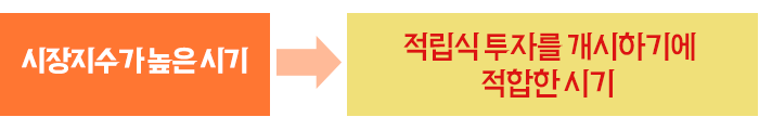 또 시장지수가 높아 보이는 시기엔 투자를 주저할 수도 있지만, 이런 시기가 오히려 ‘적립식’ 투자를 개시하기에 적합한 시기입니다.