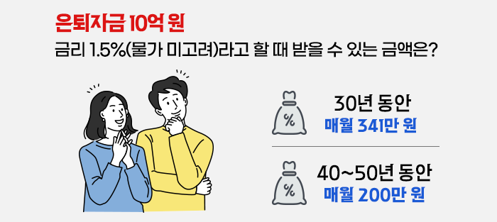 10억 원에 대한 금리를 1.5%(물가 미고려, 연복리)라고 하면 30년동안 매월 341만 원 정도를 받을 수 있는 금액입니다.