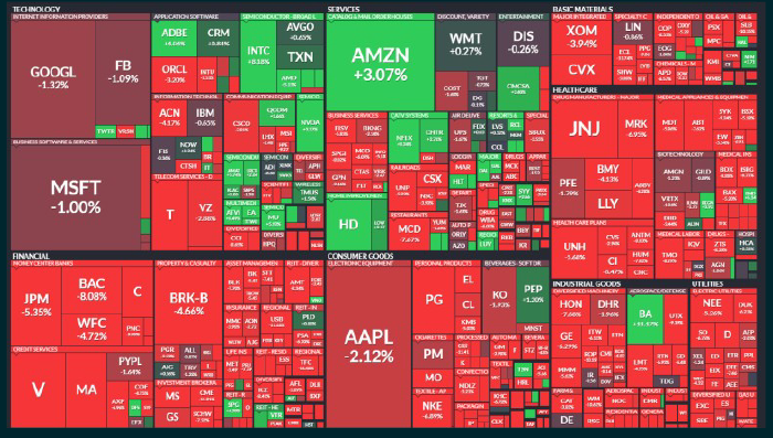상승한 종목은 초록색, 하락한 종목은 빨간색으로 표시되어 있음을 알 수 있습니다. 온통 빨간 불로 투자자들의 가슴이 덜컹한 무시무시한 날이었겠네요.