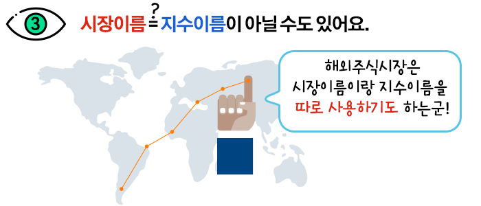 한국에서는 주식시장 이름도 KOSPI시장, KOSDAQ시장, 주가지수 이름도 KOSPI지수, KOSDAQ지수 입니다.