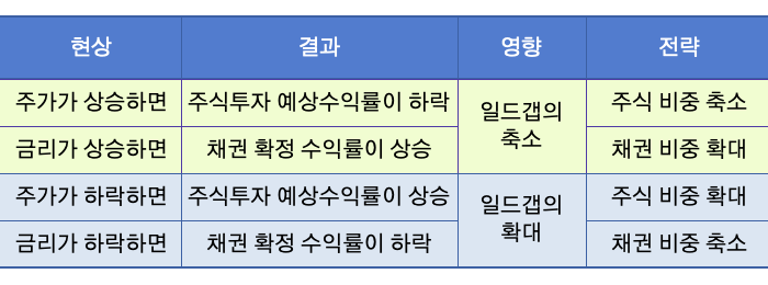 주식투자 예상 수익률이 올라가거나 금리가 하락해서 채권 확정 수익률이 하락하는 경우, 주식에 대한 비중을 늘리고 채권의 비중을 줄이는 전략 또한 가능하게 됩니다.