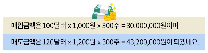 만약 주당 100달러 미국주식 300주를 매입하였다가 주가가 120달러로 올랐을 때 매도했다고 가정해볼께요.