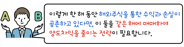 만약 2021년 한 해 동안 A라는 해외주식을 통해서 900만 원을 벌었고, B라는 해외주식을 통해서 300만 원 손실을 보았다면 이 둘을 합산하여 양도차익을 600만 원으로 본다는 거죠.
