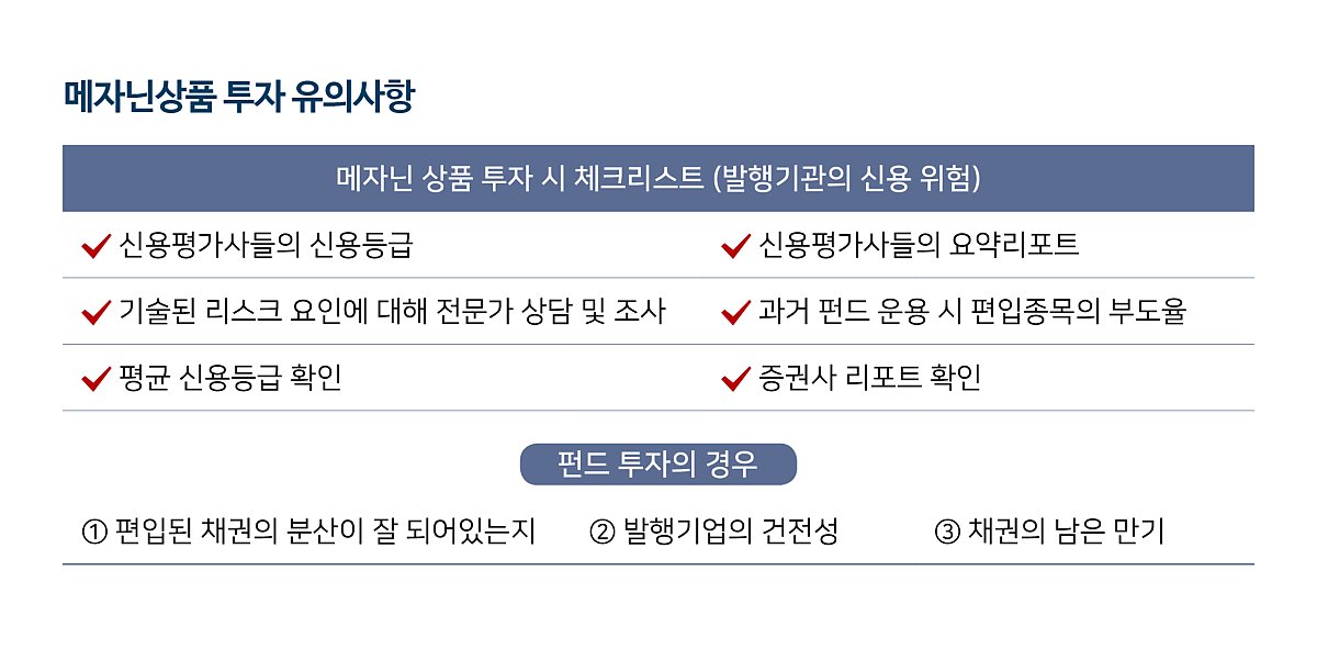 이 외에도, 과거 펀드 운용 시 편입 종목의 부도율이나 평균 신용등급을 확인해서 위험관리 역량을 비교해 보는 것도 메자닌 펀드의 옥석을 가릴 수 있는 방법 중 하나이다. 비슷한 성과를 보이는 펀드들이라면 당연히 평균 신용등급이 높고 부도율이 낮을수록 더욱 운용역량이 뛰어난 펀드라고 볼 수 있다.