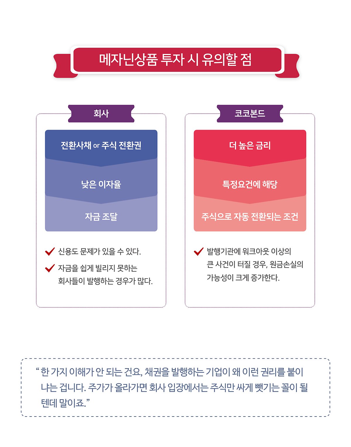 코코본드의 경우에도 구조는 다르지만 위험에 처할 수 있는 상황은 마찬가지다. 평소에 발행하는 회사채보다 더 높은 금리를 주는 대신에 발행기관이 부실해져 특정요건에 해당되는 순간에는 주식으로 자동 전환되는 조건이기 때문이다. 발행기관에 워크아웃 이상의 큰 사건이 터질 경우 원금손실의 가능성이 크게 증가하게 된다.
