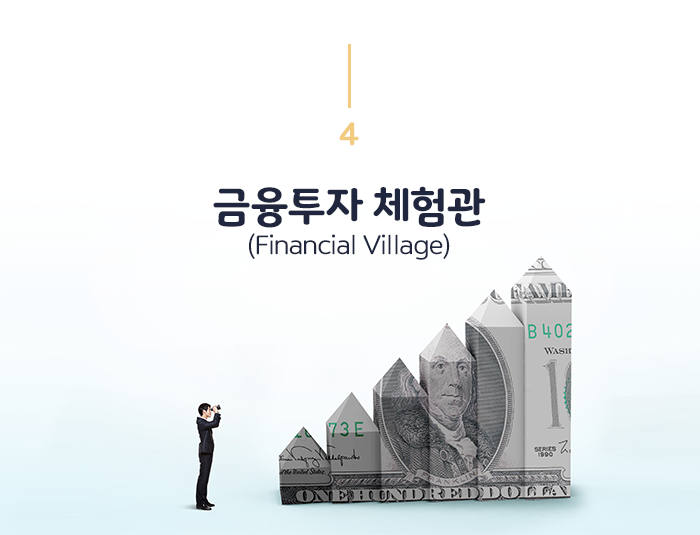 파이낸셜빌리지(Financial Village)은 어린이, 청소년, 대학생, 성인에 이르기까지 전 연령대가 함께 참여하여 최신 멀티미디어를 통해 금융과 투자를 체험할 수 있는 세계 최초의 체험형 학습관입니다.