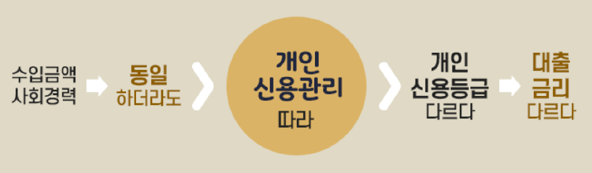 김광일 씨는 이번에 대출을 받으려다가 깜짝 놀란 일이 있었다. 입사 동기인 박기찬 씨보다 대출금리가 무려 1.5%나 높았기 때문이다. 하도 억울해서 그 이유를 알아보니 김광일 씨의 개인신용등급이 박기찬 씨보다 3등급이나 낮다는 것이다.
