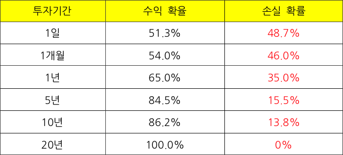위의 실제 수익률 분석결과를 보면, 왜 장기투자를 해야 하는지 절로 느끼게 될 것입니다.