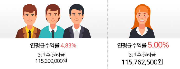 세 오빠들의 연평균수익률은 4.83%로 3년 후 원리금이 115,200,000원으로 동일했고, 막내딸의 연평균수익률은 5.00%로 3년 후 원리금은 115,762,500원이었습니다.