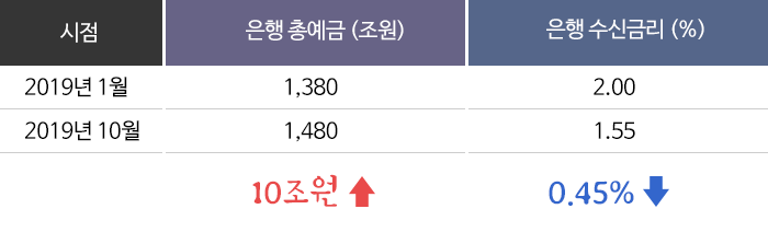 한국은행 경제통계시스템의 자료에 의하면 2019년 1월 2.00%의 은행 수신금리가 2019년 10월 연 1.55%까지 하락했음에도 불구하고 총 예금액은 10조 원이나 늘었습니다.