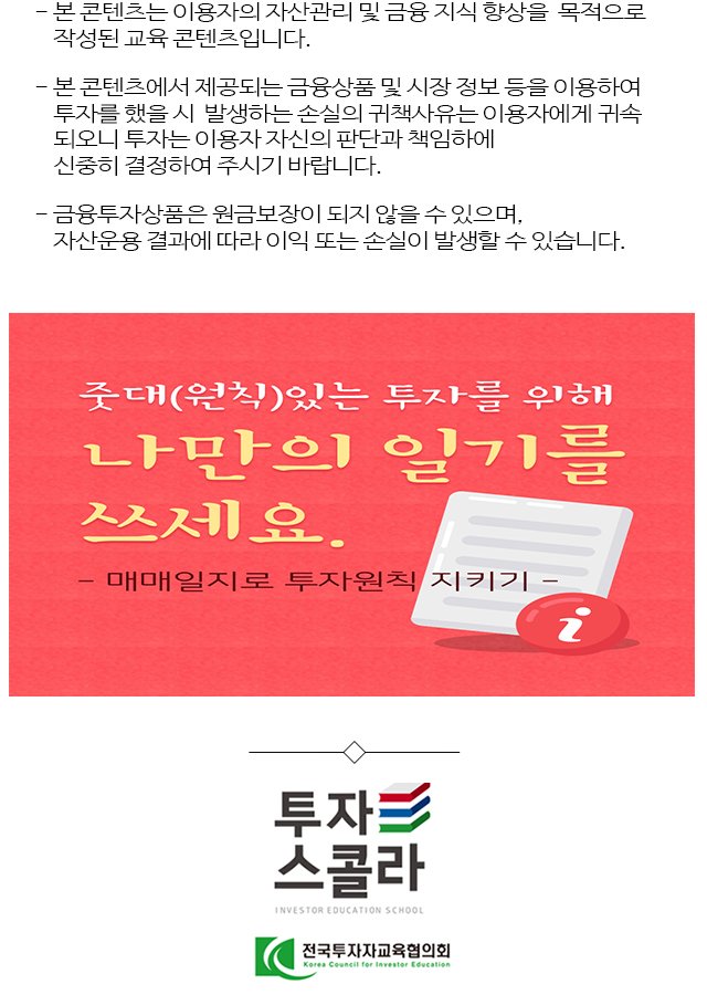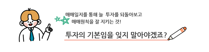 매매 전과정을 돌아보고, 계획과 실행이 다른 경우 그 원인과 대책을 기록하여 둡니다. 이렇듯 매매일지를 통해 늘 투자를 되돌아보고 매매원칙을 잘 지키는 것이 투자의 기본임을 잊지 말아야 할 것입니다.