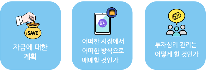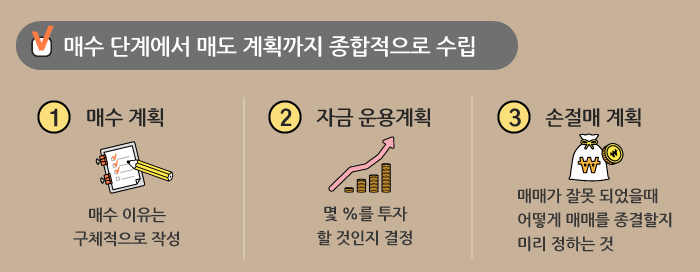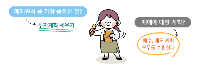 매매원칙으로서 중요한 투자계획은, 매수 후 반드시 실행해야 하는 것이므로 매수 단계에서 매도 계획까지 종합적인 계획을 수립해야 하는 것입니다.