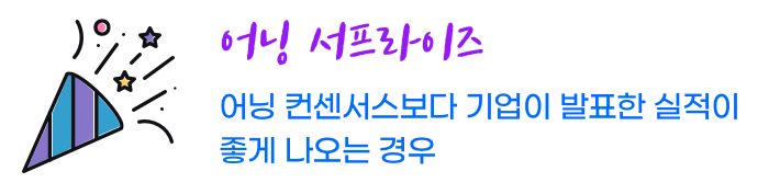 1월부터 6월까지 실적에 대한 증권사의 평균 예상치를 보통 어닝 컨센서스(earning consensus)라고 하는데요, 이 예상치보다 실제로 기업에서 발표한 실적이 좋게(보통+10% 이상) 나올 때 어닝 서프라이즈(earning surprise)라고 부릅니다.