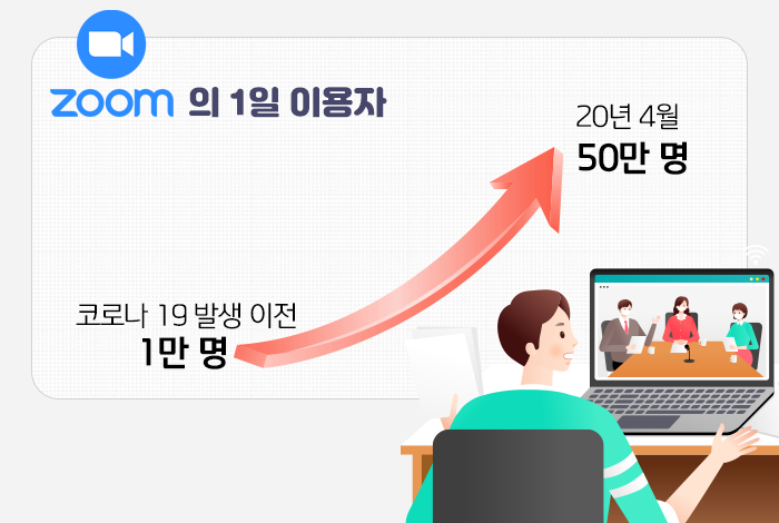 실례로 국내에서 해당 서비스를 제공하는 줌(ZOOM)의 경우, 코로나19 발생 전에는 하루 1만 명 수준이었던 사용자가 코로나 감염이 정점을 찍었던 2020년 4월 중순에는 50만 명까지 많이 늘어났습니다.