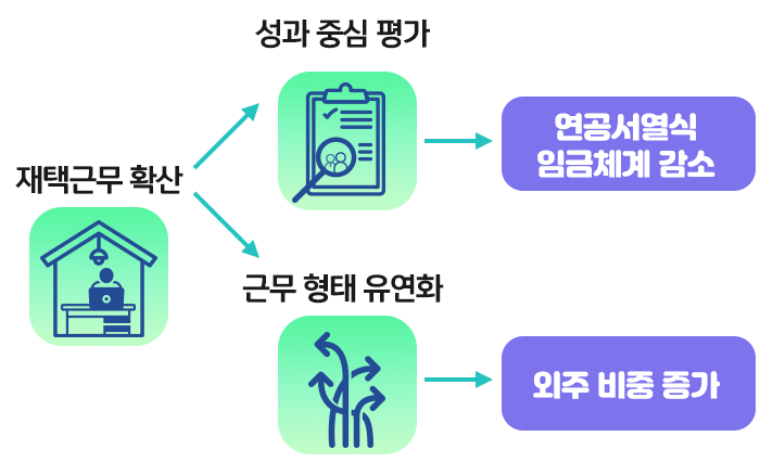 이렇게 재택근무가 확산되면 근로조건에도 영향을 줄 수밖에 없습니다. 급여 지급과 승진 등 인사평가의 기준이 시간이 아니라 성과를 중심으로 바뀌기 때문입니다.