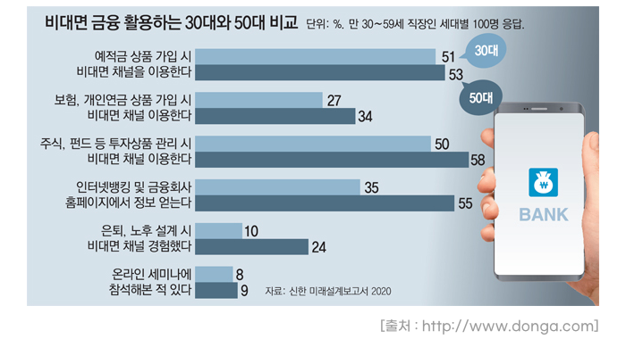 50대는 58%가 비대면 채널을 이용한다고 답해,