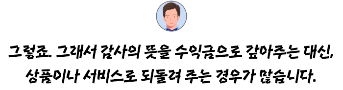 예를 들어, 영화 제작비를 지원해 주는 후원자에게는 영화관람권을, 음반 제작 비용을 후원해 준 후원자에게는 제작한 음반을 주는 등의 예가 대표적입니다.
