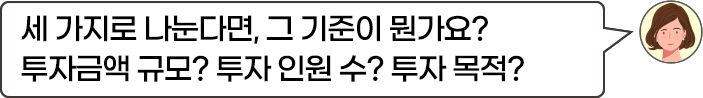 조금 더 자세한 설명을 위해, 크라우드 펀딩을 세 가지 종류로 나눠서 알아볼게요.