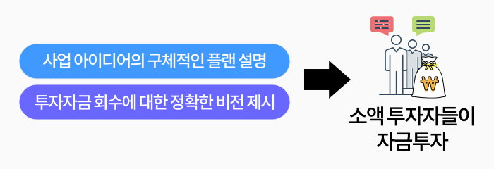 다른 목적의 크라우드 펀딩과 마찬가지로 투자 자금을 받고자 하는 사람이나 기업이 자신의 사업 아이디어에 대한 구체적인 플랜을 설명하고, 투자 자금 회수에 대한 정확한 비전을 제시하면, 이를 보고 소액 투자자들이 자금 투자를 하는 구조입니다.