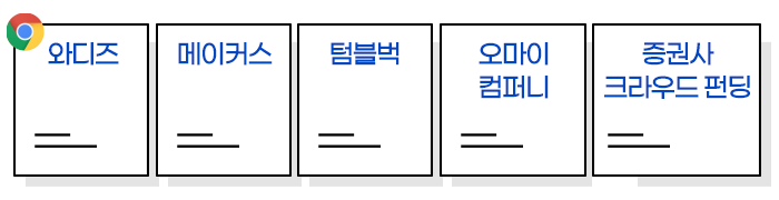 투자형 크라우드 펀딩을 전문적으로 하는 사이트로는 와디즈, 메이커스, 텀블벅, 오마이컴퍼니 등이 있으며 IBK 투자증권, 유진투자증권 등도 크라우드 펀딩에 참여하고 있습니다.