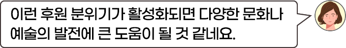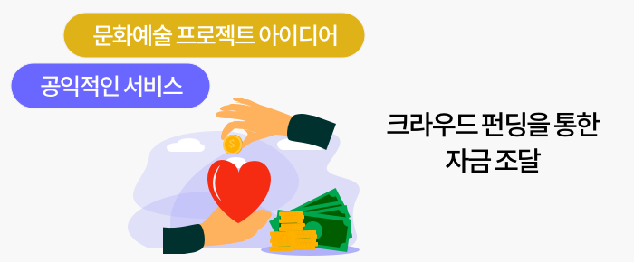 하지만 이젠 좋은 문화예술 프로젝트를 실행할 수 있는 아이디어나 공익적인 서비스 등을 구현하기에 자금 사정이 여의치 못할 경우, 크라우드 펀딩을 통해 자금을 조달할 수 있습니다.